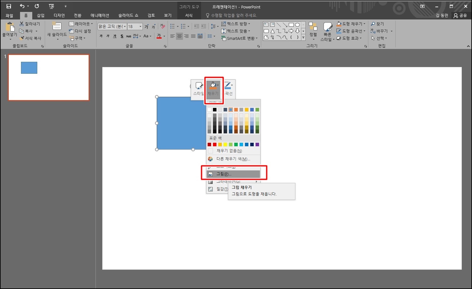 다시 도형을 클릭하여 마우스 오른쪽 클릭 후 [채우기] -> [그림]을 선택하여 다른 이미지를 넣어주세요.