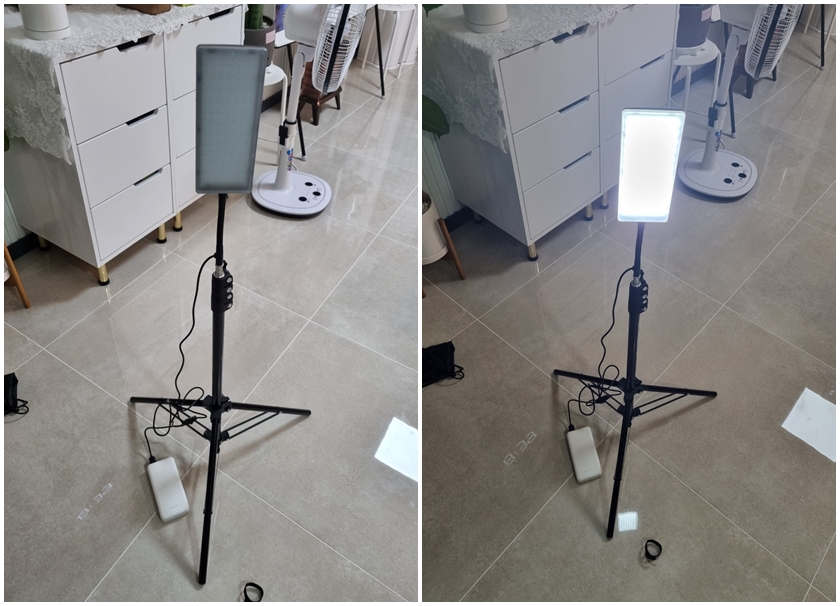 제품을 조립하고 보조배터리를 연결해서 조명을 켜봤어요. 거실 불이 켜져 있는 상태에서 켰는데도 조명이 너무 밝아서 눈뽕 맞을 것 같아요.