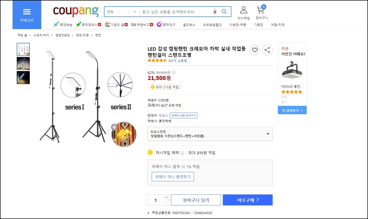 저는 캠핑 5년차인데, 처음엔 무조건 싼 것만 사서 쓰다가 하나둘씩 저에게 맞는 제품을 사면서 현재는 루프탑텐트까지 도달하게 되었어요. 캠핑 조명도 건전지로 사용하는 조그마한 랜턴을 사용하고 있었는데, 사용하는데 큰 문제는 없지만 좀 더 밝고 캠핑 분위기를 한껏 올려주는 전기가 없이도 노지에서도 사용할 수 있는 보조배터리를 이용한 스탠드 조명을 구입하게 되었어요.