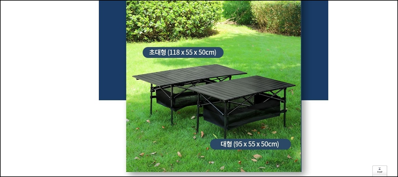 사이즈는 대형과 초대형으로 2인이시라면 대형, 그 이상이라면 초대형 사이즈를 구매하는 게 좋을 것 같아요. 저희 부부는 둘만 다니는 캠핑이지만 가끔 지인들과 가는 경우가 있어 좀 더 큰 초대형 테이블로 구매하게 되었어요.