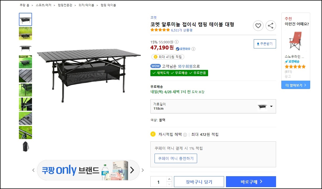 쿠팡에서 제가 구매한 "코멧 알루미늄 접이식 캠핑 테이블"이에요. 가격도 적당하고 검정색이라 더러워져도 크게 티가 나지 않을 것 같아서 구매하게 되었어요. 혹시 주문 위치가 궁금하시다면 아래 링크를 클릭하시면 돼요.
