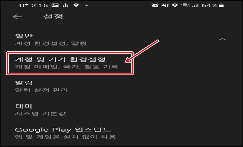 일반 탭을 선택 후 하위 메뉴 중 "계정 및 기기 환경설정"메뉴로 들어가 주세요.