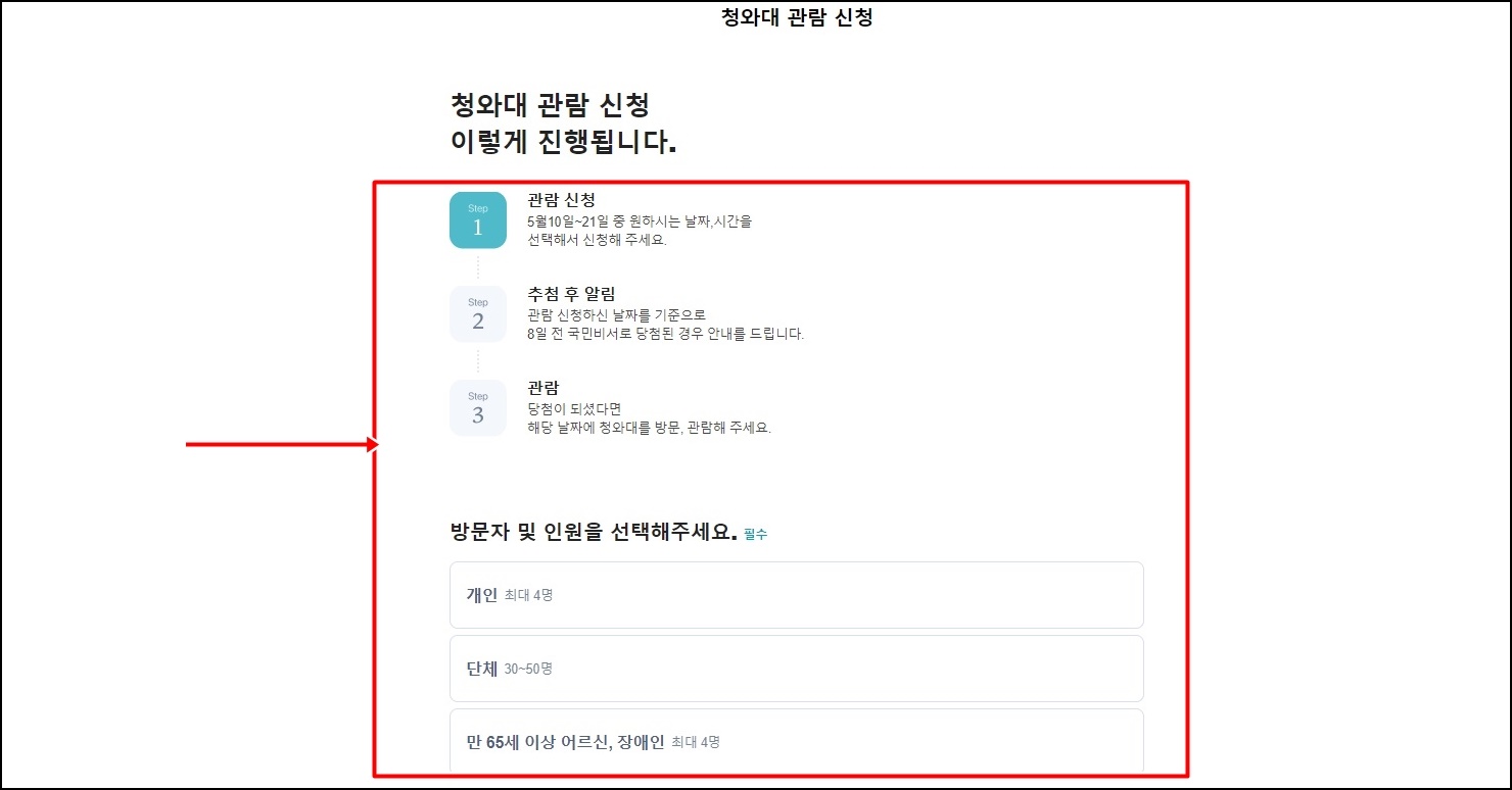 방문자 및 인원을 선택해주세요. [개인이 신청할 경우 최대 4인, 단체는 30~50명까지, 만 65세 이상 어르신, 장애인은 최대4명까지 신청]이 가능하니 인원을 꼭 확인해주세요.