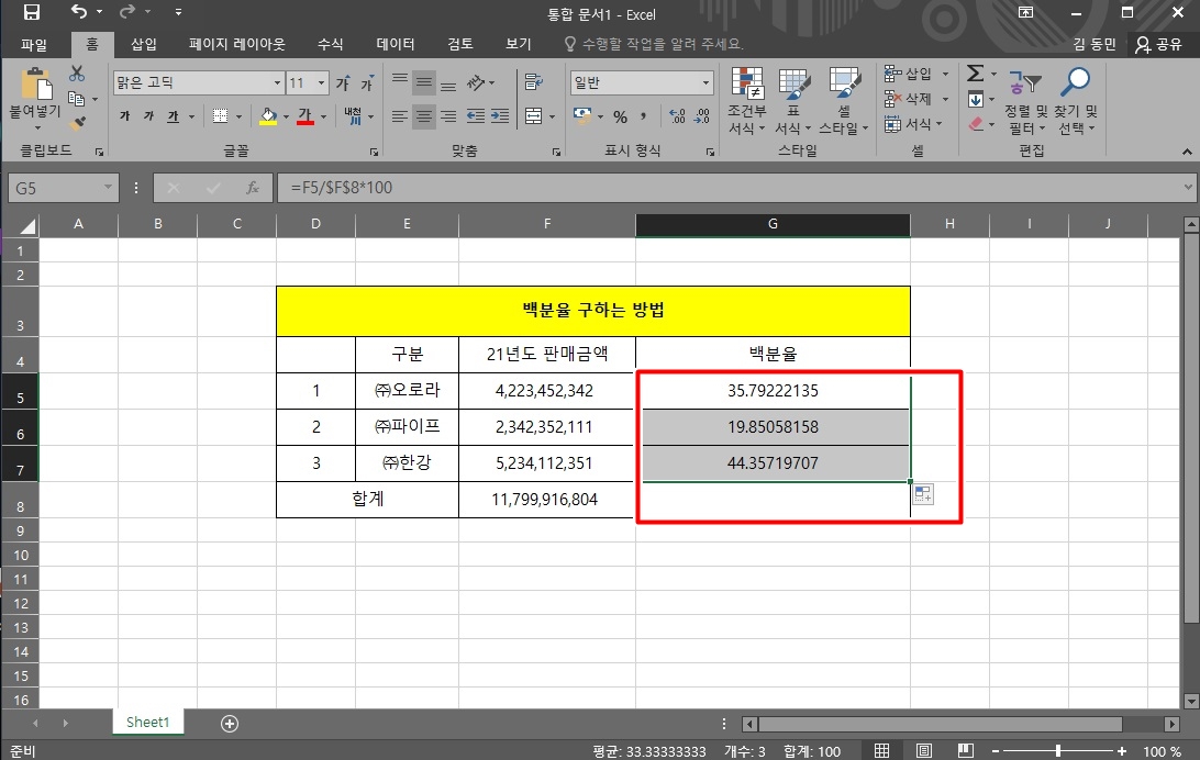 위 사진과 같이 백분율이 구해졌어요. 생각보다 참 쉽죠?^^