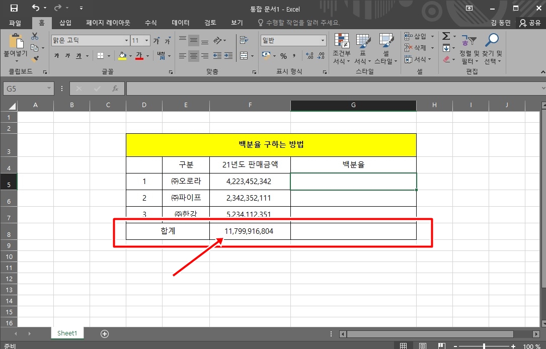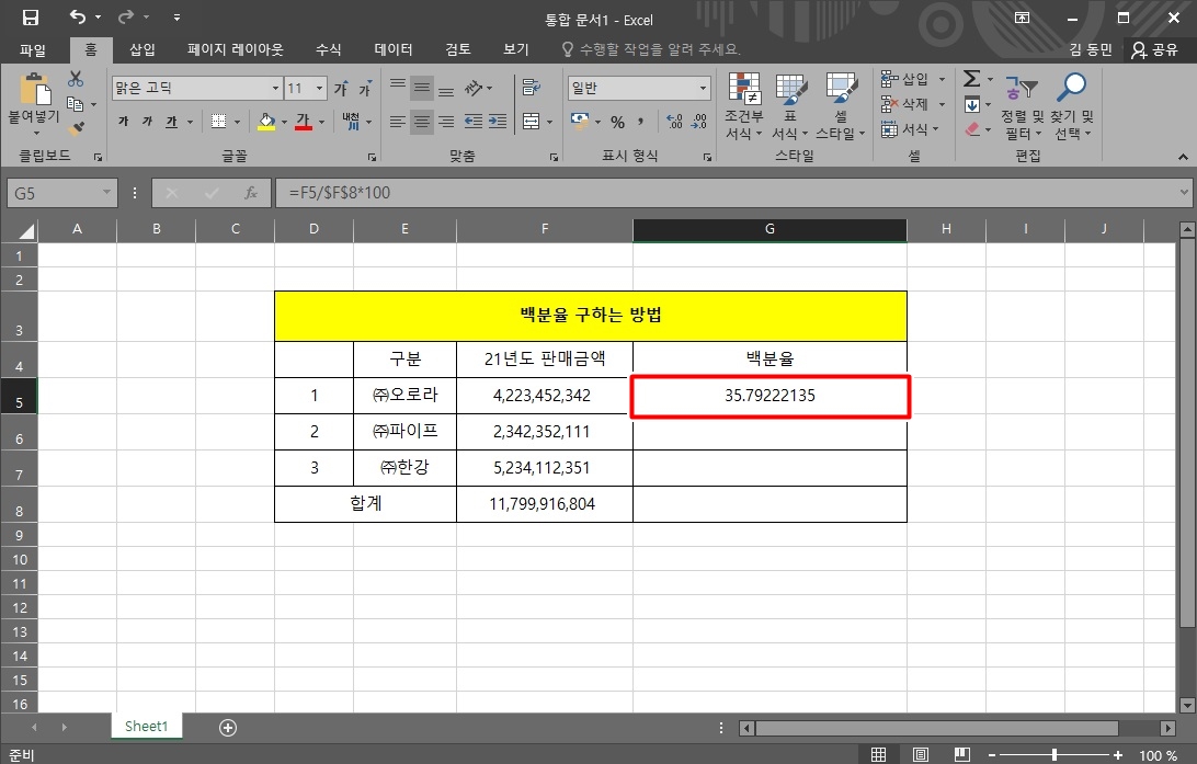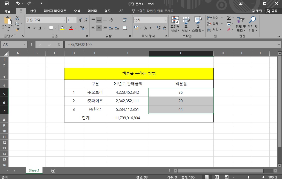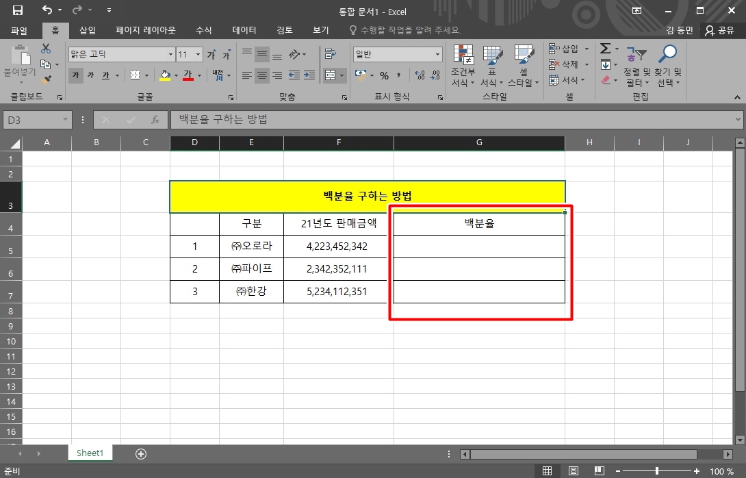 자 위와 같은 예시로 설명을 드릴게요. 총 (주)오오라, (주)파이프, (주)한강 3사의 21년도 판매 금액이 나와있는데 각 회사마다 판매율 혹은 점유율이 얼마나 되는지 백분율로 구해보도록 할게요.