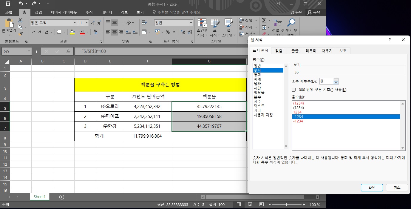 백분율 부분에 마우스 오른쪽 클릭 후 [셀 서식]으로 들어가 주세요. 표시 형식 탭에서 [숫자] -> [소수 자릿수]를 0으로 설정하시고 [확인] 버튼을 클릭해주세요.
