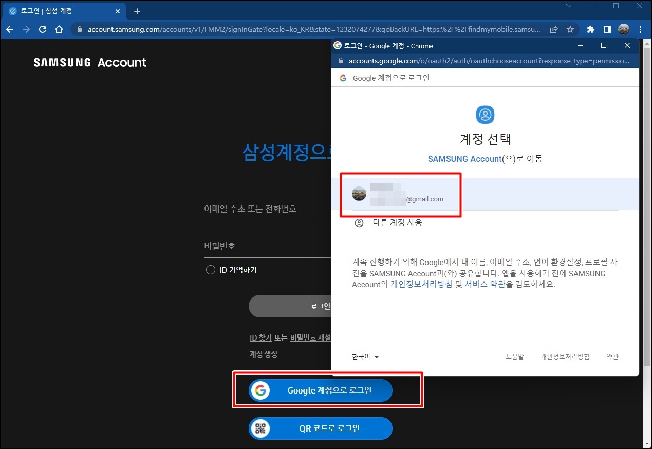 그러면 삼성계정 로그인 창이 뜨는데 삼성 계정으로 로그인하셔도 되고 구글 계정으로 로그인하셔도 돼요. 저는 구글 계정으로 로그인해볼게요.