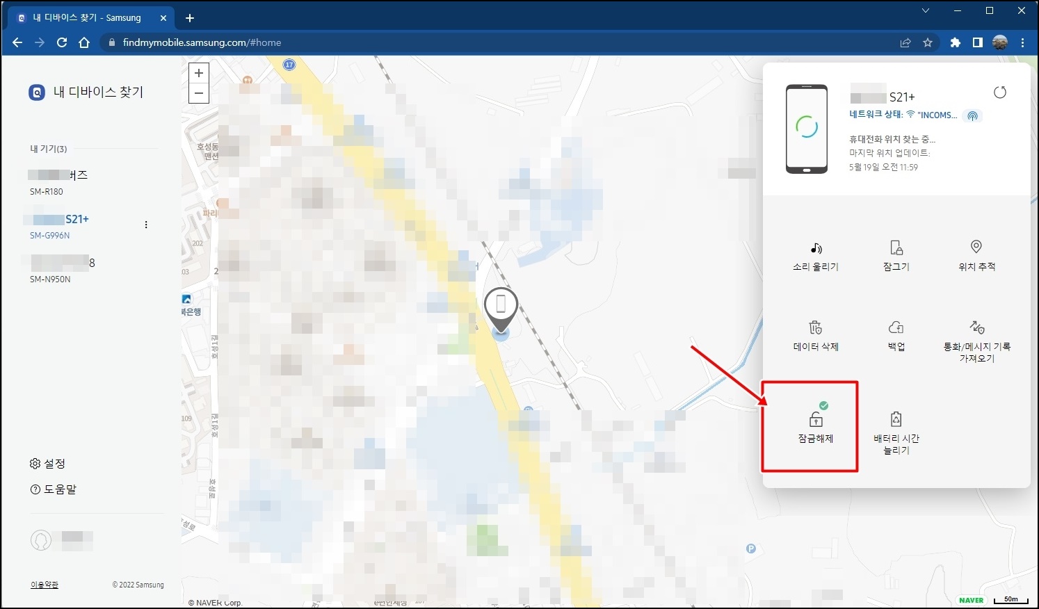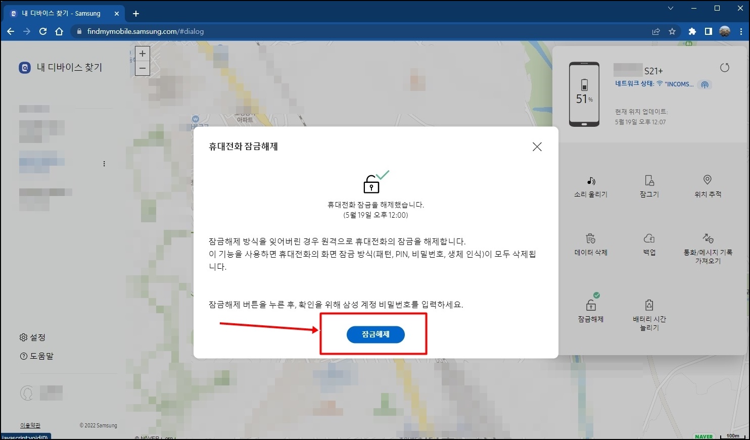 로그인을 하면 위 사진과 같이 현재 내 디바이스의 위치등을 확인할 수 있는데 스마트폰의 잠금 해지를 위해서 오른쪽 중간의 [잠금해제] 버튼을 클릭해주세요.