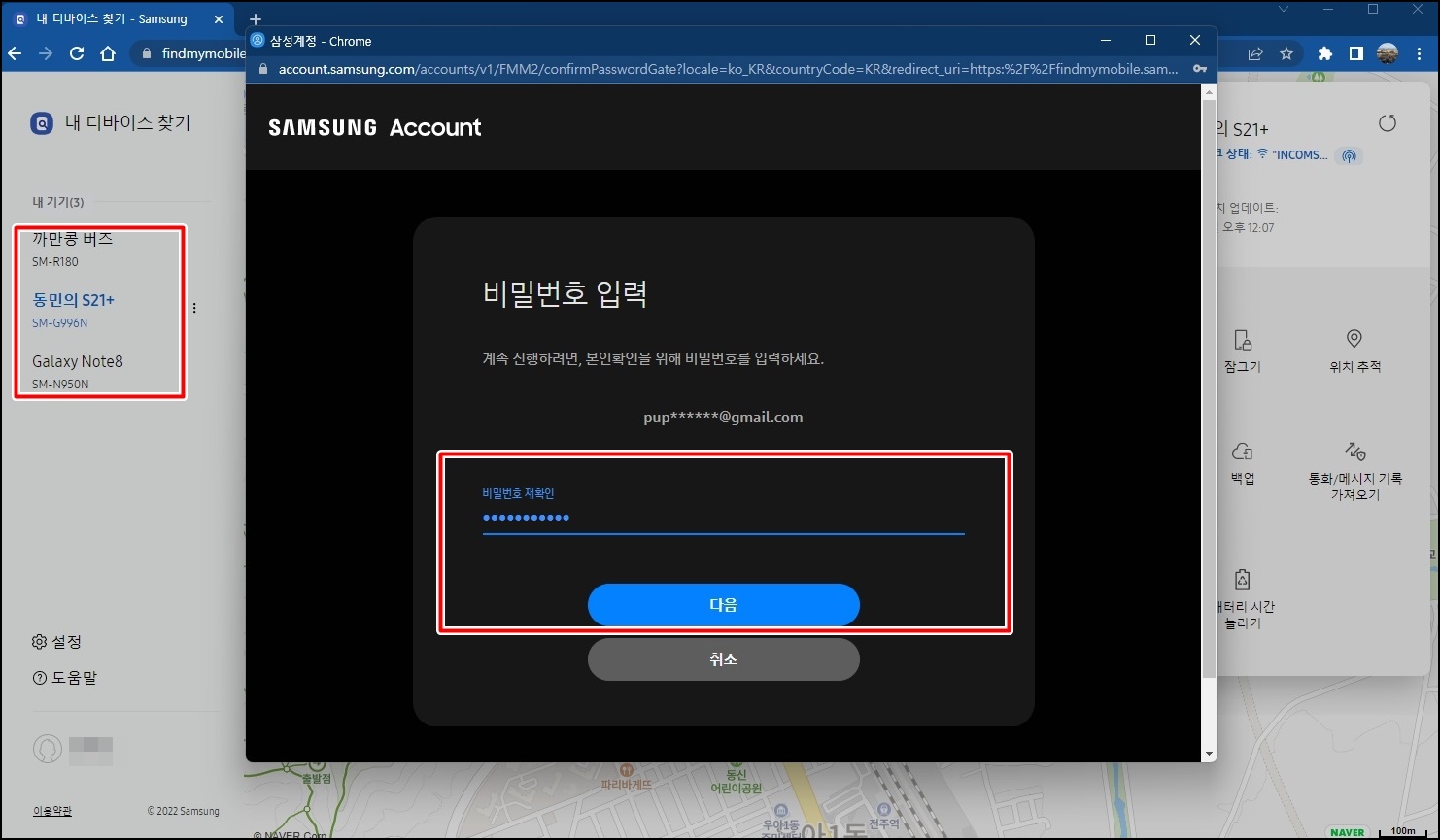 마지막으로 구글계정이나 삼성 계정으로 그 인했던 패스워드를 입력 후 [다음]을 클릭하면 스마트폰의 잠금이 해지가 되실 거예요. 참 쉽죠?^^