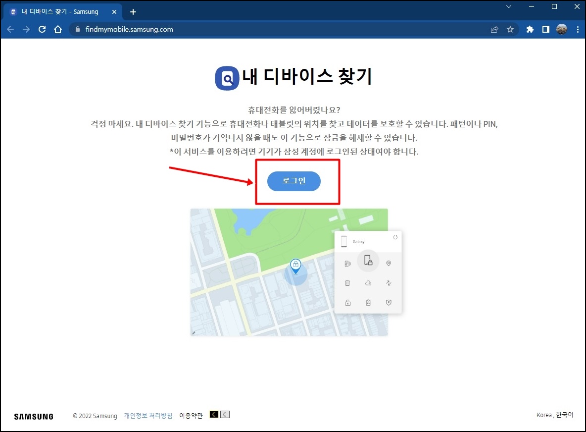 링크를 클릭하여 접속하면 위 사진과 같이 "내 디바이스 찾기" 사이트를 확인할수 있는데 화면과 같이 [로그인] 버튼을 클릭해주세요.
