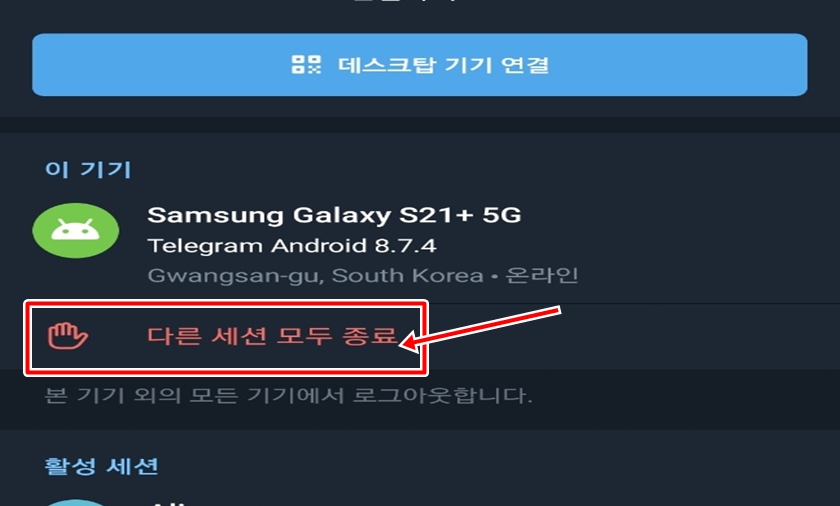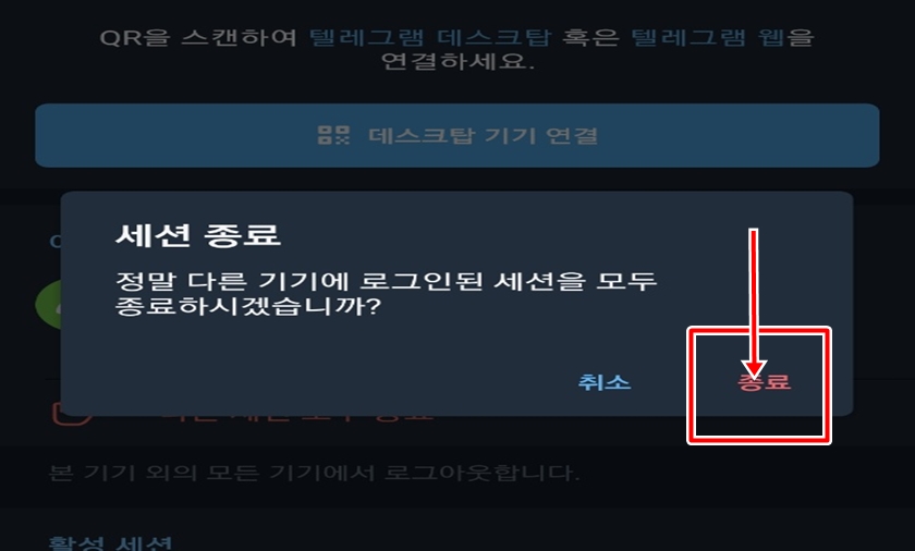 "정말 다른 기기에 로그인된 세션을 모두 종료하시겠습니까?"메시지가 나오면 [종료] 버튼을 클릭해주시면 PC텔레그램 원격 로그아웃이 완료가 돼요.