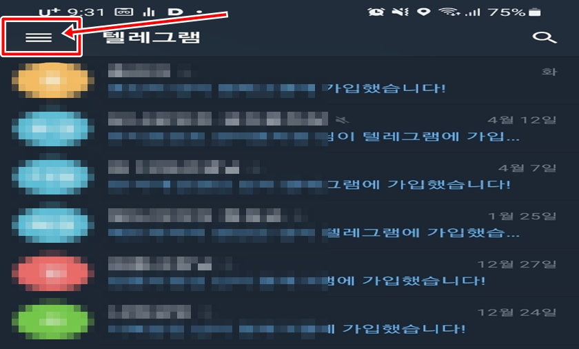 우선 스마트폰에서 텔레그램 어플을 실행해주세요. 상단의 三 메뉴 아이콘을 클릭해주세요.