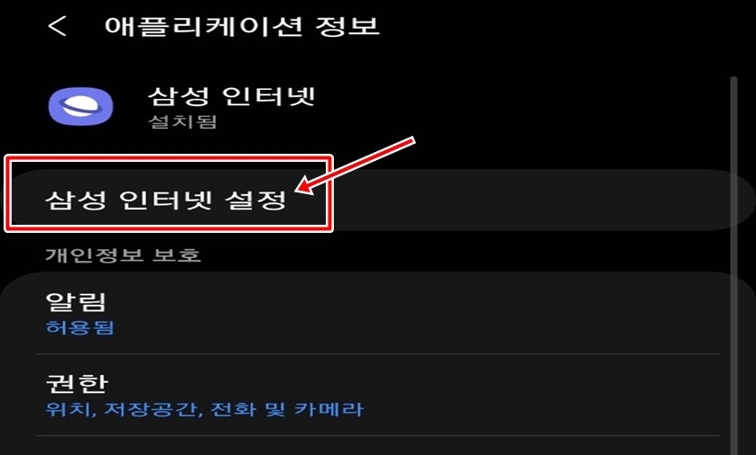 애플리케이션 하위 메뉴에서 위 사진과 같이 [삼성 인터넷] 앱을 찾아서 선택해서 들어가 주세요.
