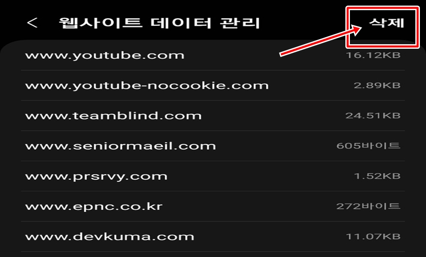 웹 사이트 데이터 관리로 들어가시면 기존에 접속했던 웹사이트 데이터의 목록들이 보이실 텐데, 삭제를 진행해주셔야 돼요. 위 사진과 같이 오른쪽 상단의 [삭제] 버튼을 클릭해주세요.