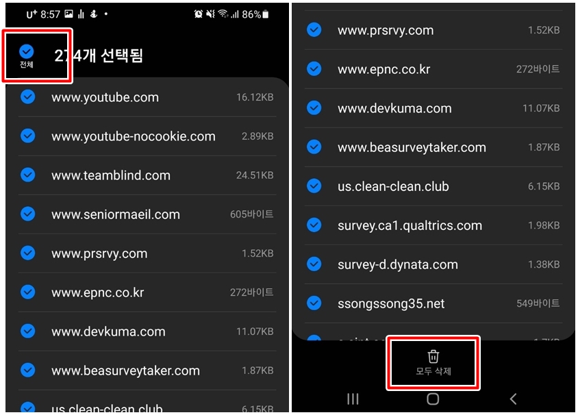 위 사진과 같이 [전체] 선택을 하신 뒤 페이지 하단의 [모두 삭제]를 클릭하시면 웹사이트 데이터 목록이 사라지는 건 확인하실 수 있을 거예요. 이제 스마트폰을 한번 재부팅하시고 인터넷검색을 해보시면 인터넷 검색 속도가 조금 빨라졌다는걸 느끼실수 있을거에요.