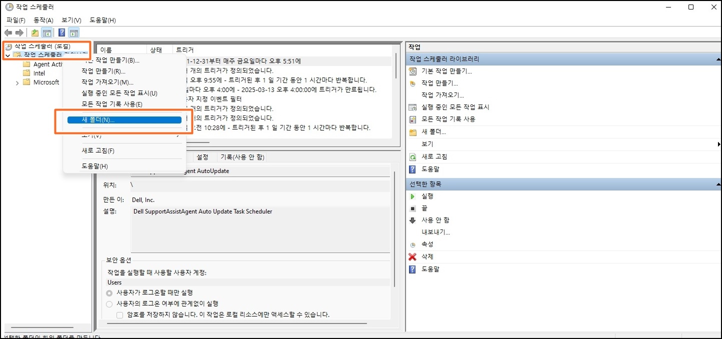 왼쪽 상단의 "작업스케줄리"에 마우스 오른쪽 클릭 후 "새 폴더"를 만들어주세요.