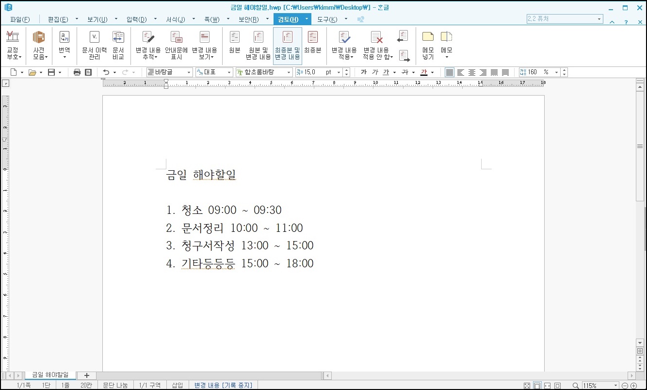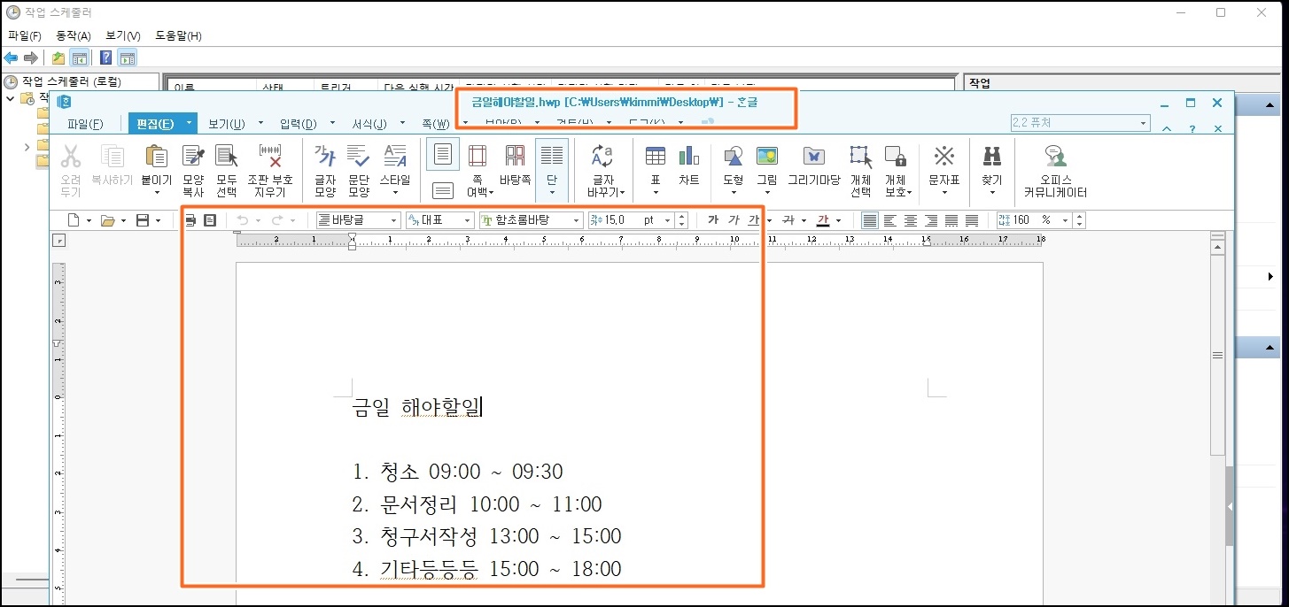 우선 간단한 예를 들어 위와 같은 한글 문서가 있다고 가정해볼게요. 한글문서에는 내가 오늘 해야 할 일들을 시간별로 적어놨는데, 시간 때마다 해당 업무들을 자동으로 보여주면 까먹지 않고 진행할 수 있겠죠? 그럼 이 한글 문서를 자동으로 띄어볼까요?