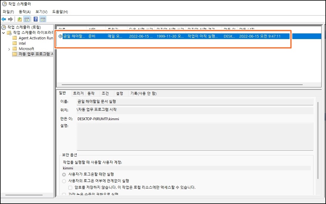 이제 작업은 예약되었어요. 현재 상태는 준비 상태고 작업이 아직 실행되지 않았는데, 지정된 시간에 프로그램이 실행되는지 기다려볼게요.
