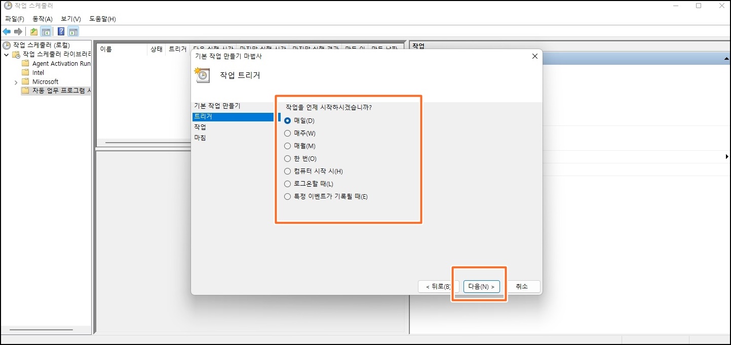 작업 시작은 매일, 매주, 매월, 한번, 컴퓨터 시작, 로그인할 때 등 여러분이 필요에 따라 선택 후 [다음]을 클릭해주세요. 저는 테스트로 매일을 선택했어요. "다음"을 클릭해주세요.