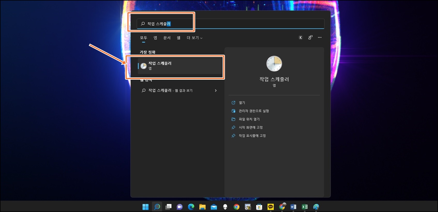 자 윈도 검색창에 "작업 스케줄러"라고 검색하시고 앱을 실행해주세요.