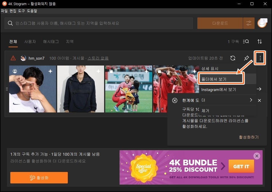 "구독당 100개 이상의 게시물을 다운로드하고 하루에 200개 이상의 게시물을 다운로드하려면 활성화" 하라고 나오네요. 일단 정상적으로 사진이 다운로드 됐는지 확인해볼까요?