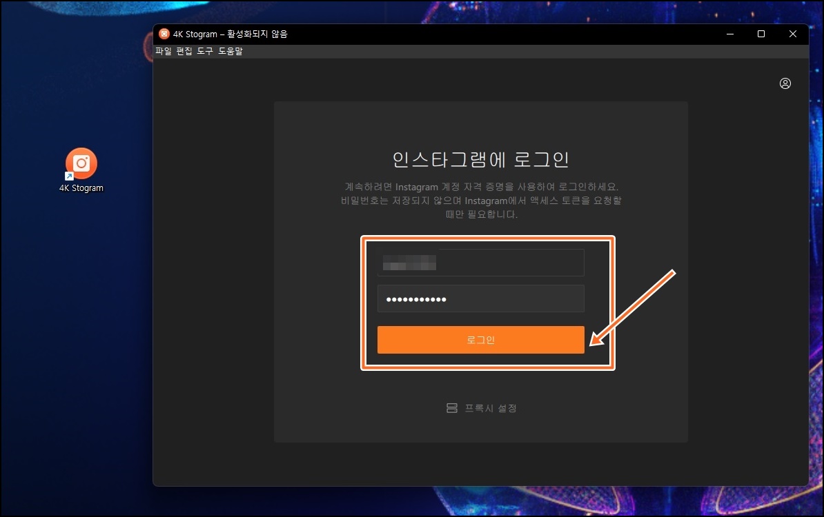 설치가 완료되면 바탕화면 4K Stogram 아이콘이 생성되며 프로그램이 실행돼요. 사용하기 위해선 인스타그램 ID/PW로 로그인을 하셔야 돼요.