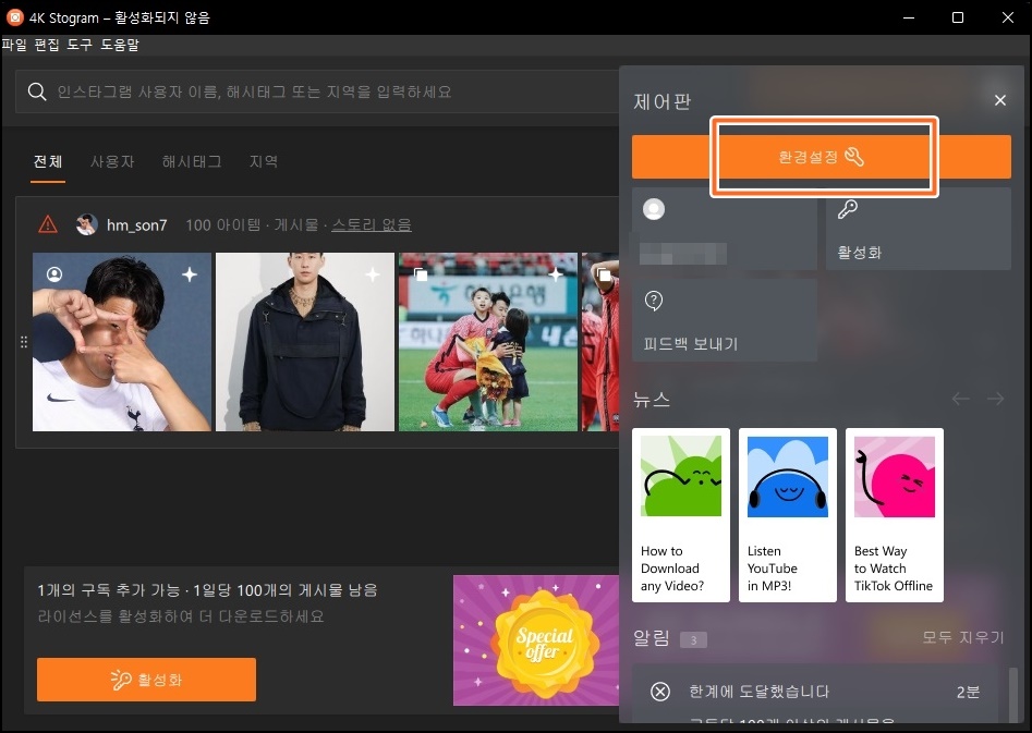4K Stogram 무료 버전은 다운로드할 수 있는 계정&해시태그의 수가 총 2개에요. 게시물 다운로드는 하루에 200개까지 가능하구요. 개인적인 백업용도라만 무료버전으로 충분히 사용할수 있는 수준인것 같아요. 200개가 게시물이 부족하면 다음날 다시 200개 추가로 다운로드 받을수 있다는것도 잊지 마세요.
