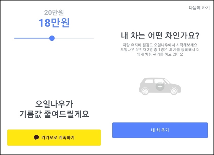 오일 나우가 기름값을 줄여준다고 하네요. "카카오톡으로 계속하기"를 클릭해서 넘어가시고 "내 차 추가"를 클릭해서 여러분의 차량정보를 입력해주세요.