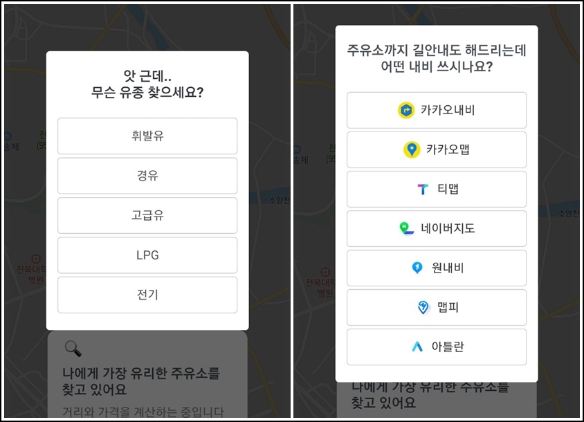유종과 주유소까지 길안내 내비를 선택해주세요.
