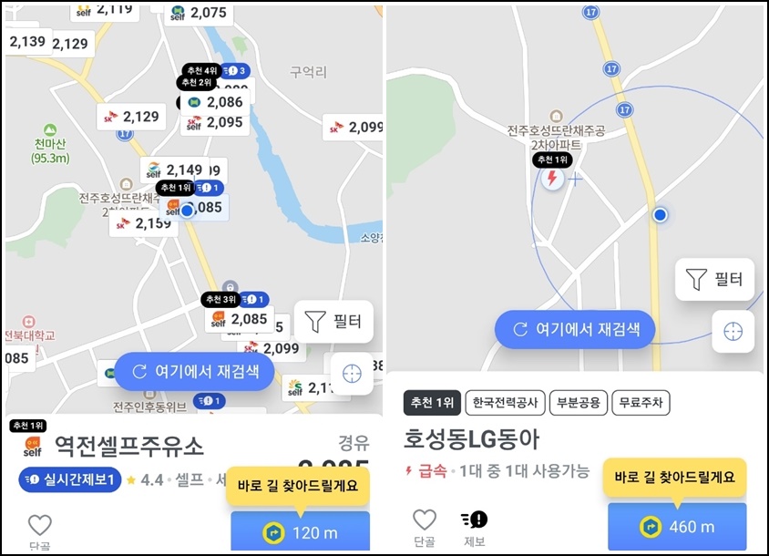 짜잔!! 왼쪽은 제 차종인 경유 최저가 주유소, 오른쪽은 최저가 전기 충전소 위치예요. 추천 1위부터 5위까지 확인이 되고 길안내까지 가능해요. 페이지에는 안 나오지만 상단의 해당 지역의 "최고가 금액"과 "최저가 금액"도 확인할 수가 있어요. 경유값이 2천 원이 넘는 날이 올 줄이야...