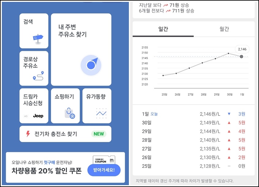 메인 페이지에서 "유가 동향"을 클릭하시면 일간, 월간 단위로 리터당 유가의 변화정보를 확인하실 수 있어요.