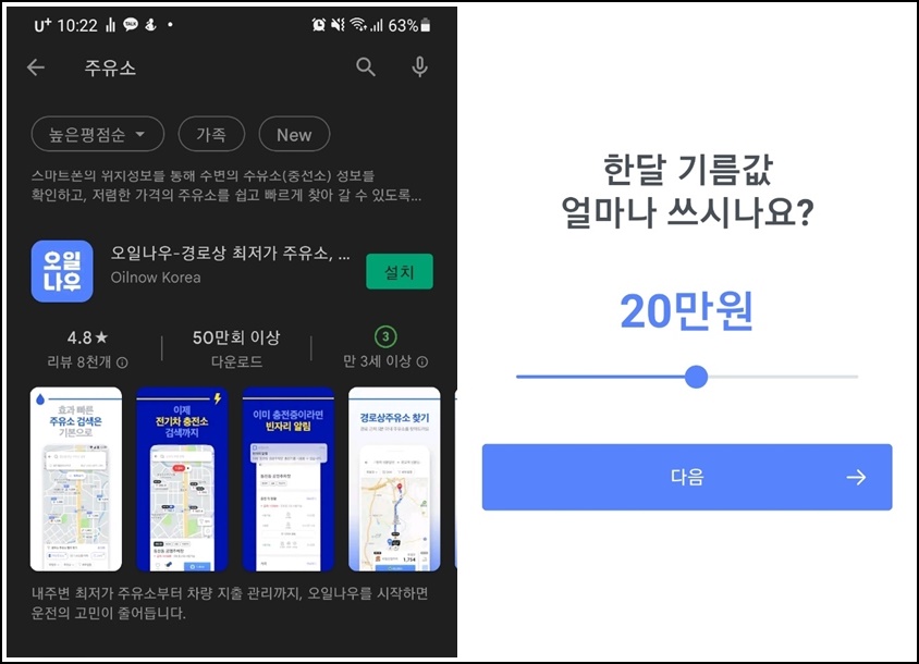 구글 플레이스토에서 주유소라고 검색을 하시면 "오일 나우"앱이 보이실 텐데 선택해서 설치를 진행해주세요. 다른 어플도 많이 있지만 오일 나우 앱이 가장 평이 좋아서 자주 이용하고 있어요.