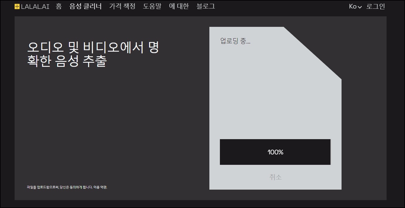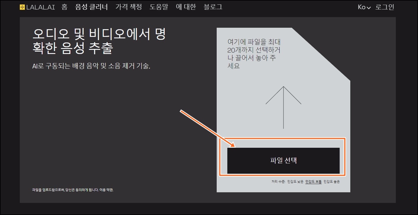 자 그럼 lalal.ai 음성 클리너&소음제거 장치 어떻게 사용하지 알아볼까요? 우선 위 링크를 클릭해서 lalal.ai 홈페이지에 접속해주세요.