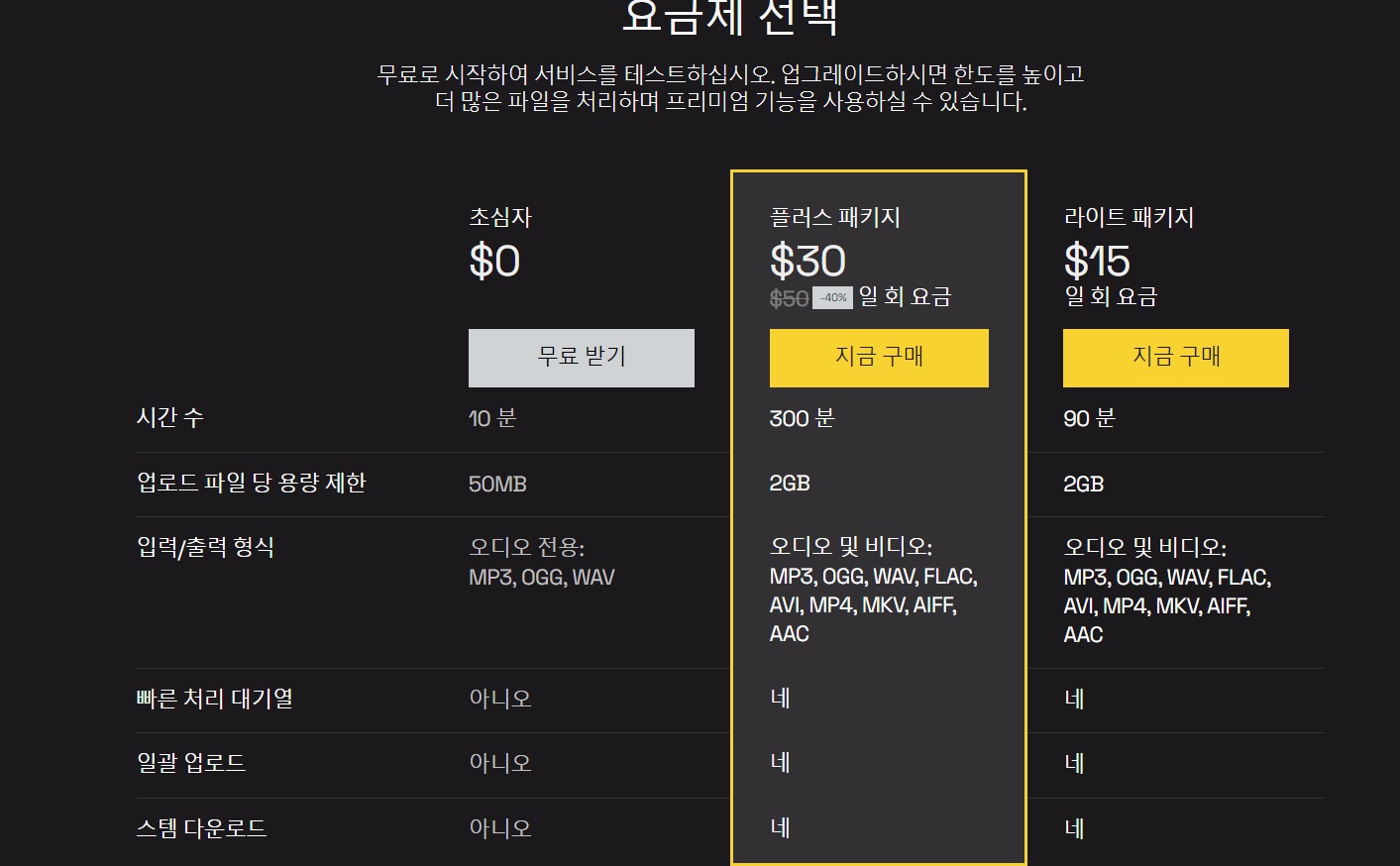 우선 요금제를 알아보셔야되는데, 초심자의 경우 시간수는 10분 업로드 파일당 용량 제한은 50MB로 제한이 있는 편이에요. 요금제를 라이트까지만 올려도 충분히 사용 가능하시니 미리 보기 등을 테스트해보시고 만족하시면 유료로 전환해 보시는 것도 좋을 것 같아요.