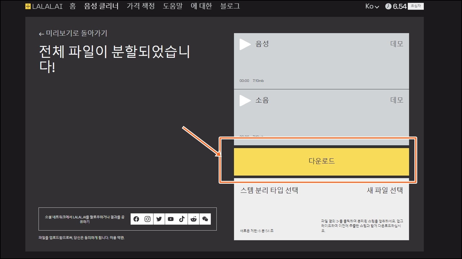 다시 lalal.ai 페이지에서 "다운로드"버튼을 클릭해주세요.