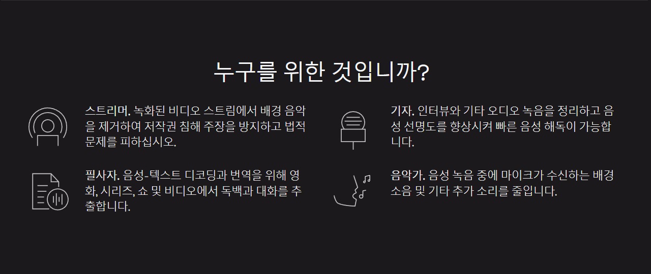 대부분 노이즈,잡음,소음등을 제거를 원하는 분들이 유튜브 동영상 제작하는 분들만 해당된다고 하시는 분들이 많은데, 기자분들의 인터뷰, 오디오 녹음 정리를 위한 목적이나, 노래를 하는 분들도 주변의 소음 등을 제거하기 위해 사용하기도 해요.