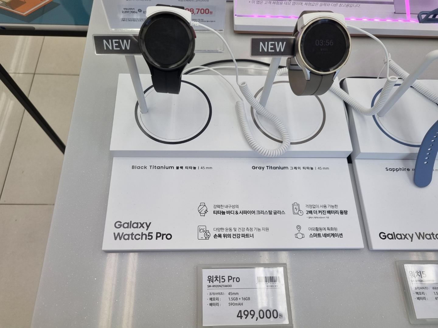 우선 제가 구입한 갤럭시워치5 프로의 경우 45mm로 일반 모델보다 큰 편이에요. 배터리도 590mAh를 탑재해 최대 80시간 사용할 수 있다는 특징이 있고 프로 모델은 티타늄 소재와 사파이어 글라스가 적용되었어요.