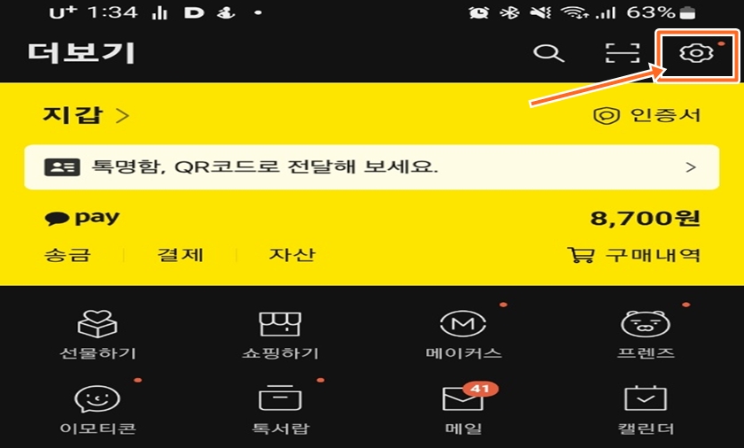 우선 카카오톡을 실행 후 하단의... 메뉴를 클릭하여 사진과 같이 상단의 설정[톱니바퀴] 아이콘을 클릭해주세요.