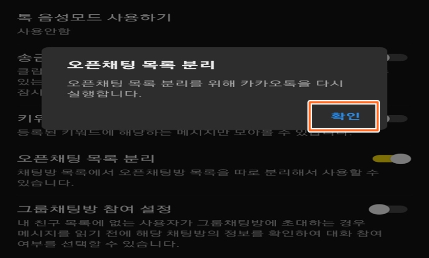 오픈래팅방 분리를 위해서 카카오톡이 다시 실행되는데 [확인] 버튼을 클릭해주세요.