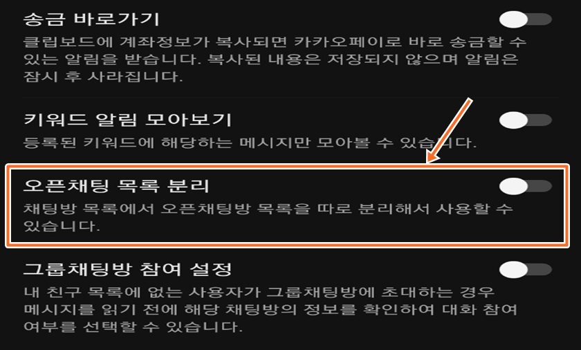 "오픈 채팅 목록 분리" 항목이 비활성화되어 있을 텐데 선택해서 활성화해주시면 일반 카톡과 오픈 채팅방이 따로 분리가 돼요.