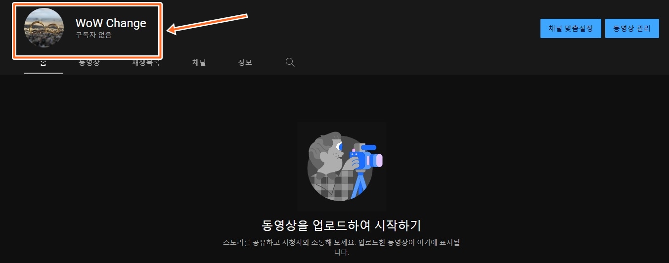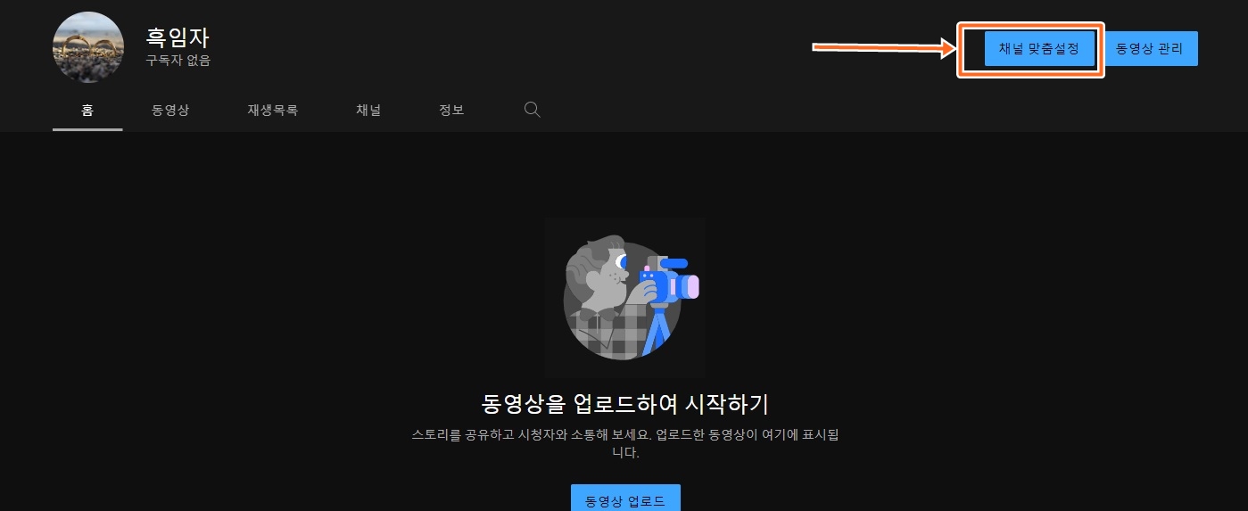 여러분의 유튜브 채널에 접속 후 메인 페이지에서 "채널 맞춤 설정"메뉴로 들어가 주세요.