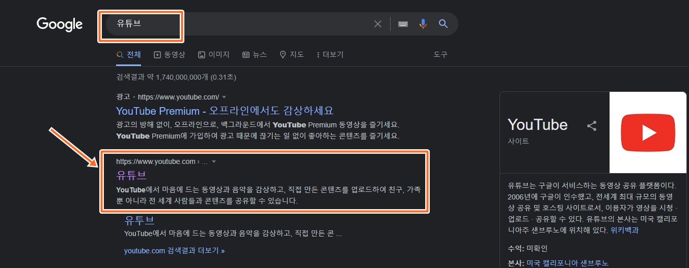 먼저 유튜브 채널 이름을 변경하기 위해선 여러분의 유튜브 채널에 접속을 해야겠죠? 검색창에 유튜브를 검색하셔서 들어가 주세요.