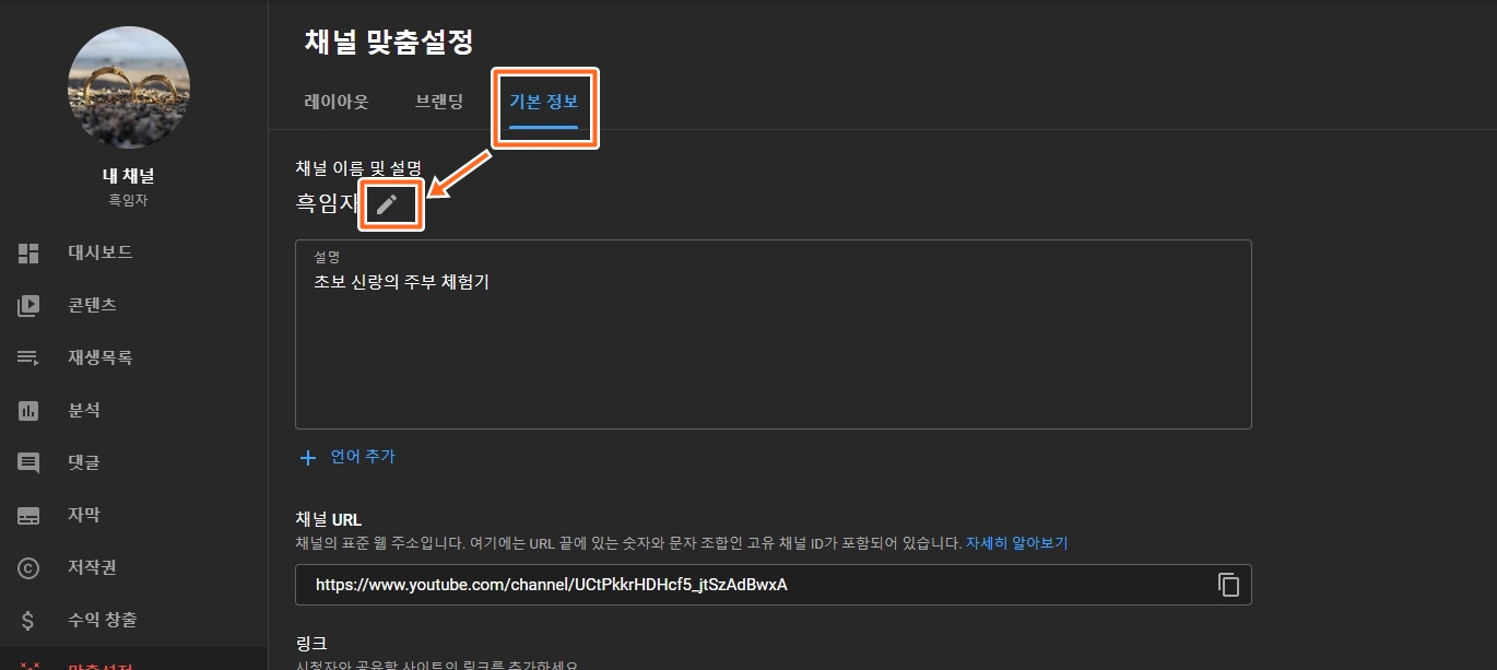 채널 맞춤 설정에서 "기본 설정"을 클릭 후 채널명의 오른쪽에 연필 모양 아이콘을 클릭해주세요.