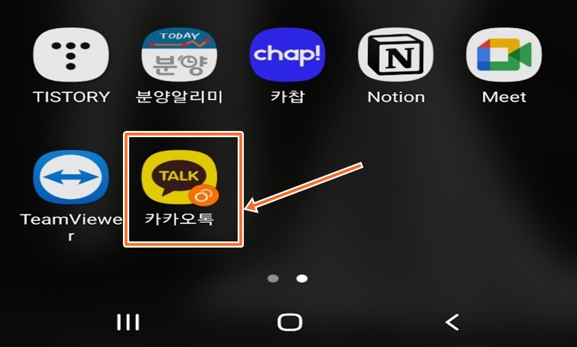듀얼 메신저 "카카오톡"이 설치가 되었어요. 위 사진처럼 카카오톡에 주황색 바탕의 하얀색 동그라미가 그려져 있는데 아이콘이 생성되었네요. 실행해볼까요?
