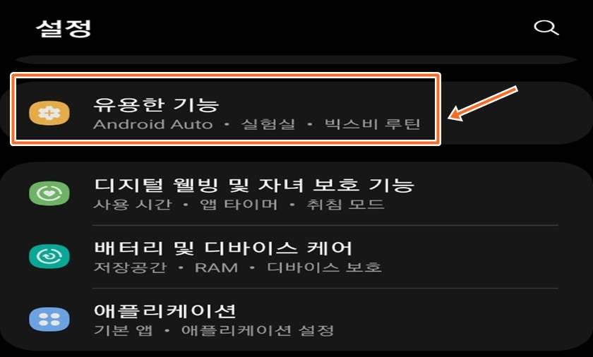설정 메뉴에서 하위 기능 중 "유용한 기능"메뉴를 클릭해서 들어가 주세요.