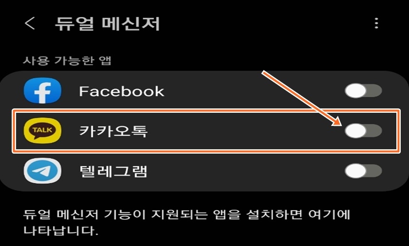듀얼 메신저 메뉴로 들어가시면 위 사진처럼 사용 가능한 앱 중에 "카카오톡"이 보이실 거예요. 비활성화되어 있는 ㅔ버튼을 클릭해서 활성화해주세요.