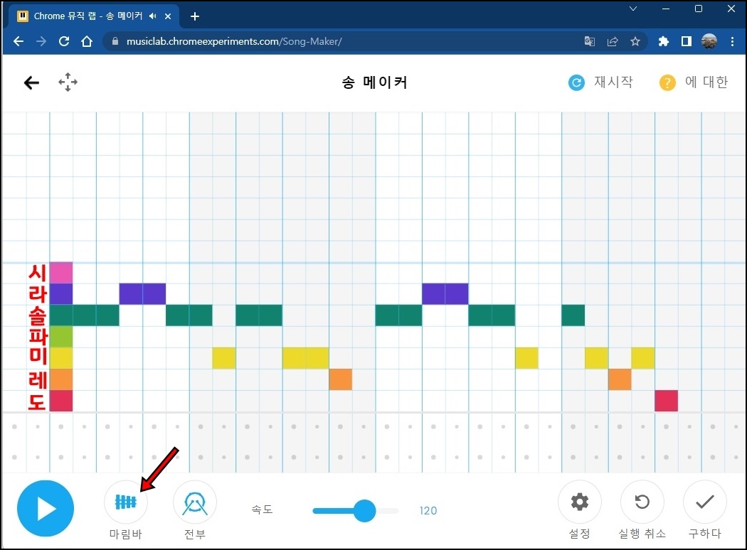 위 사진처럼 가장 아랫부분부터 도레미파솔라시도 음계가 시작되고 하단 메뉴에서 "마림바"메뉴를 클릭하시면 5가지의 악기를 설정할 수 있어요. 악기에 따라 소리가 달라지니 여러 가지 악기를 선택해서 테스트해보시면 될 것 같아요.