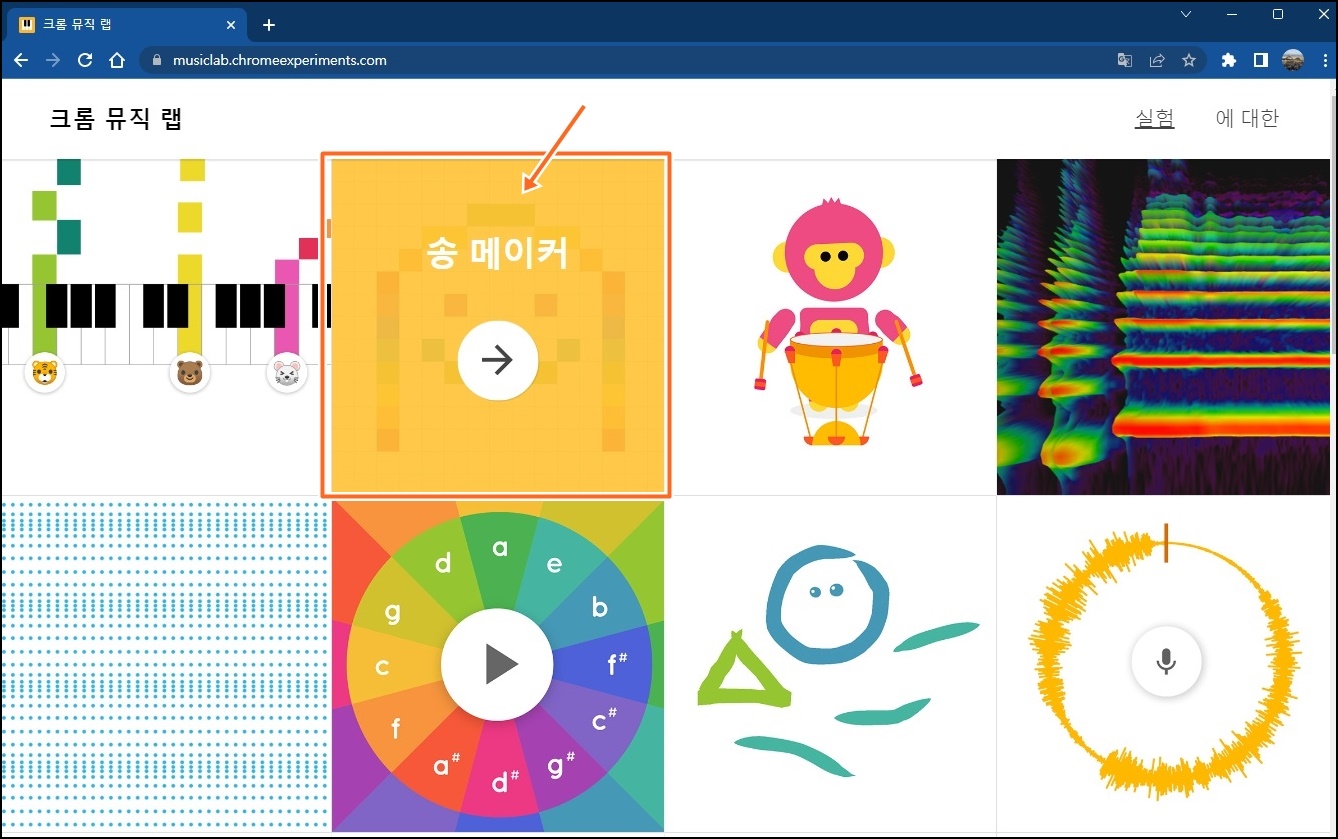 위 사진처럼 크롬 뮤직 랩에 들어가시면 여러 가지 서비스가 있는데 오늘 설명하고 있는 "송 메이커"를 선택해서 들어가 주세요.