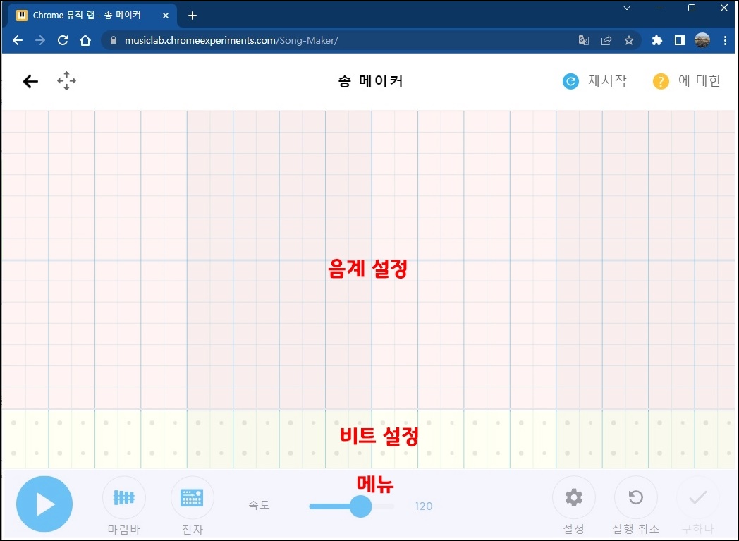 처음 송 메이커로 들어가시면 위 사진을 만날 수가 있어요. 영역은 음계 설정 부분 / 비트 설정 부분 / 메뉴 부분으로 나뉘는데요