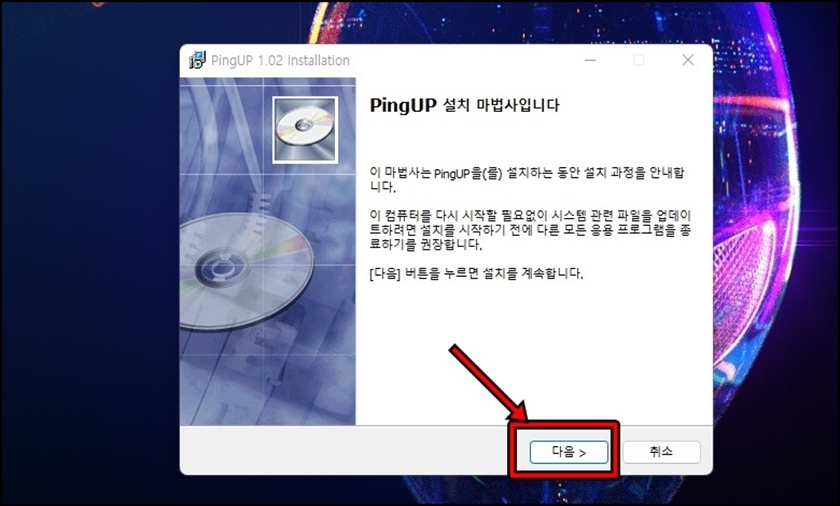 설치 파일이 다운로드 후 실행해주세요. [다음]을 클릭해서 넘어가 주세요.